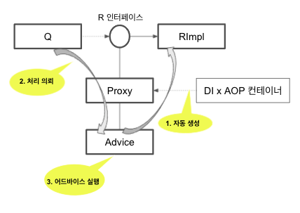· DIxAOP 컨테이너는 R 인터페이스를 구현한 프락시 클래스의 인스턴스를 자동으로 생성, Q 클래스의 R 인터페이스 변수에 인젝션한다.