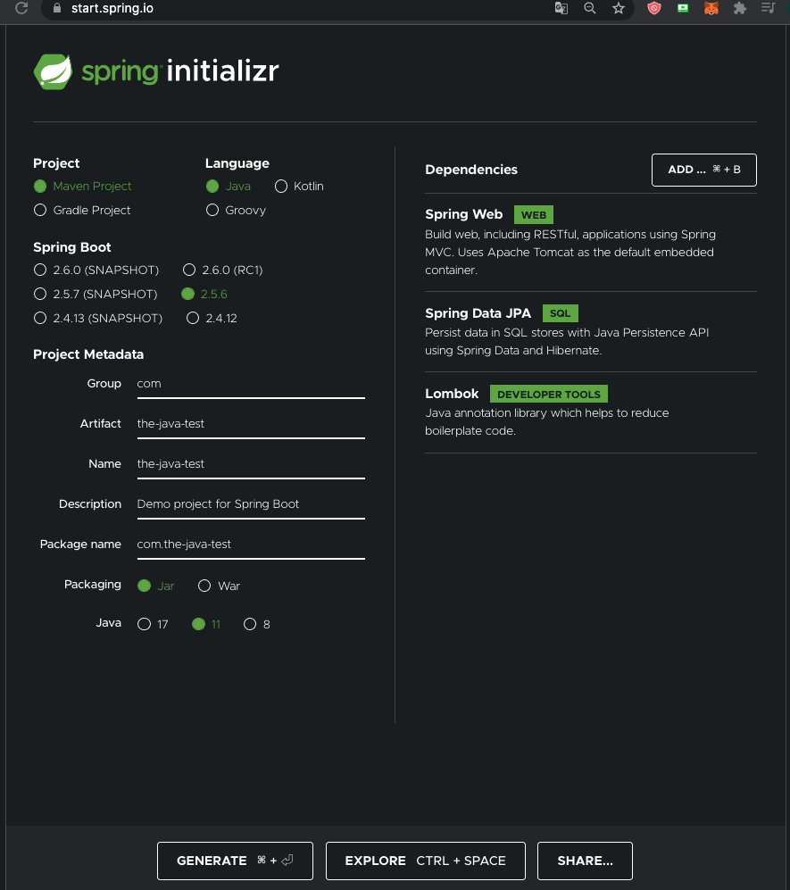 · 테스트를 작성하기 위한 스프링 부트 메이븐 프로젝트를 생성한다.