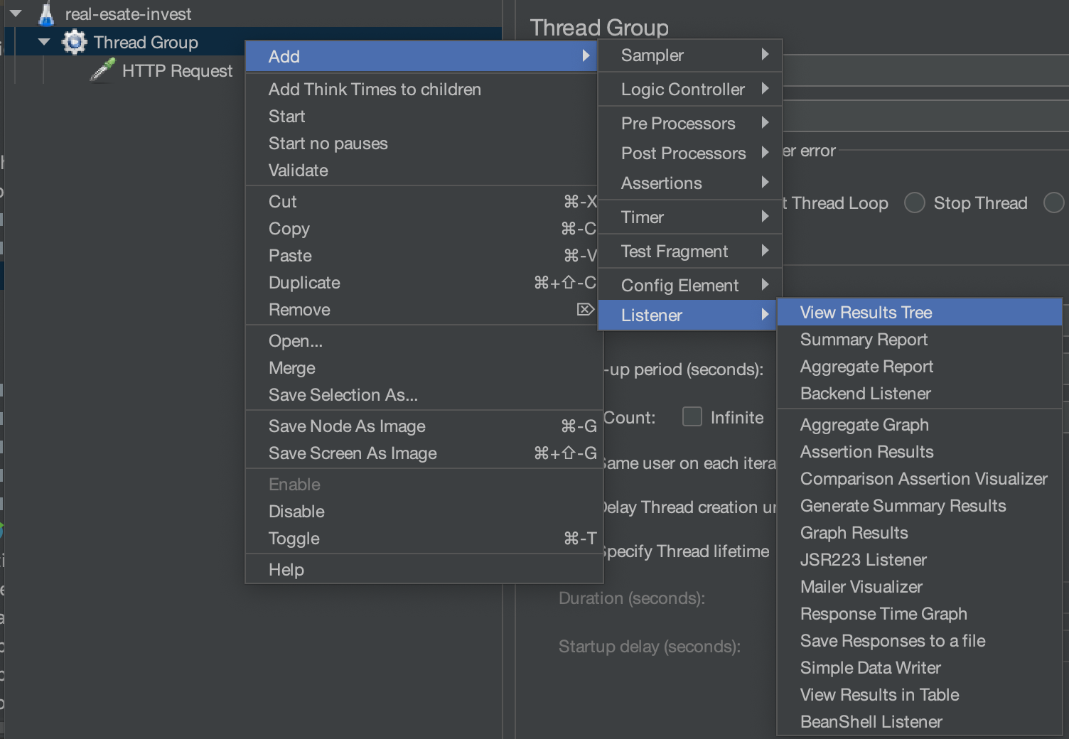 Thread Group을 우클릭하여, Add - Listener에서 다양한 Listener 들을 선택할 수 있다.