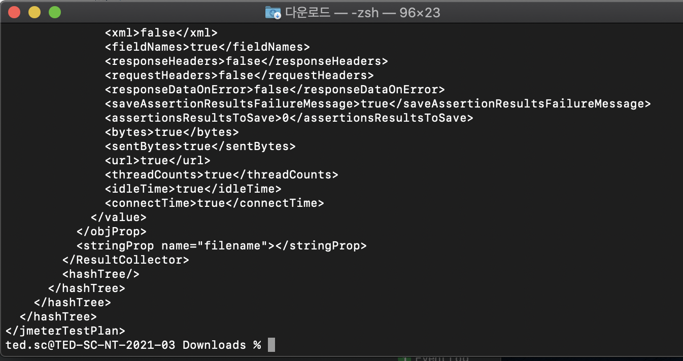 터미널에서 Cat 명령어로 해당 파일을 확인하면, 다음과 같이 저장한 테스트 내용이 XML 파일 형태로 저장된다.