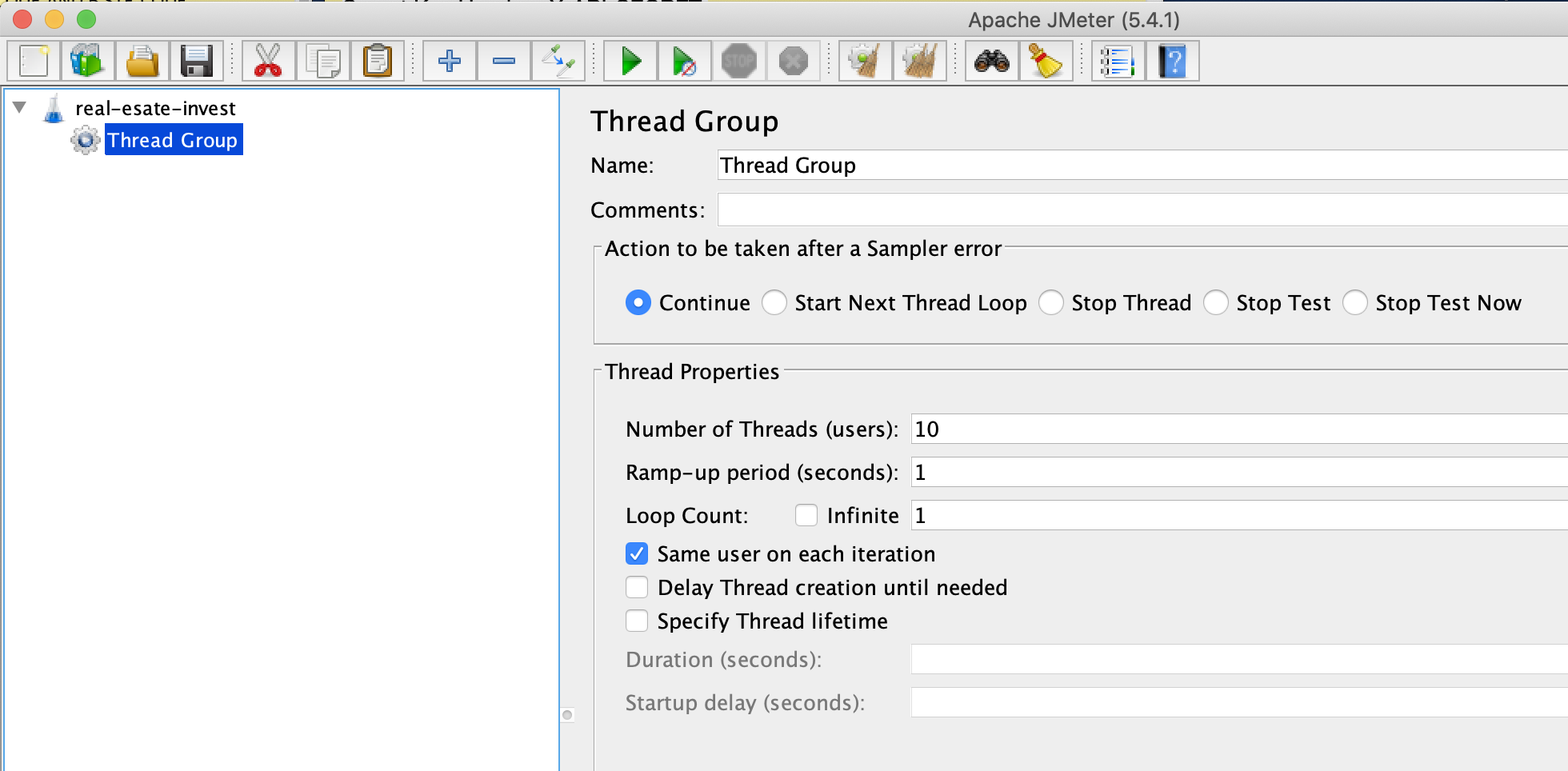생성된 Thread Group의 'Thread Properties'에서 유저를 의미하는 쓰레드 생성을 조절할 수 있다.