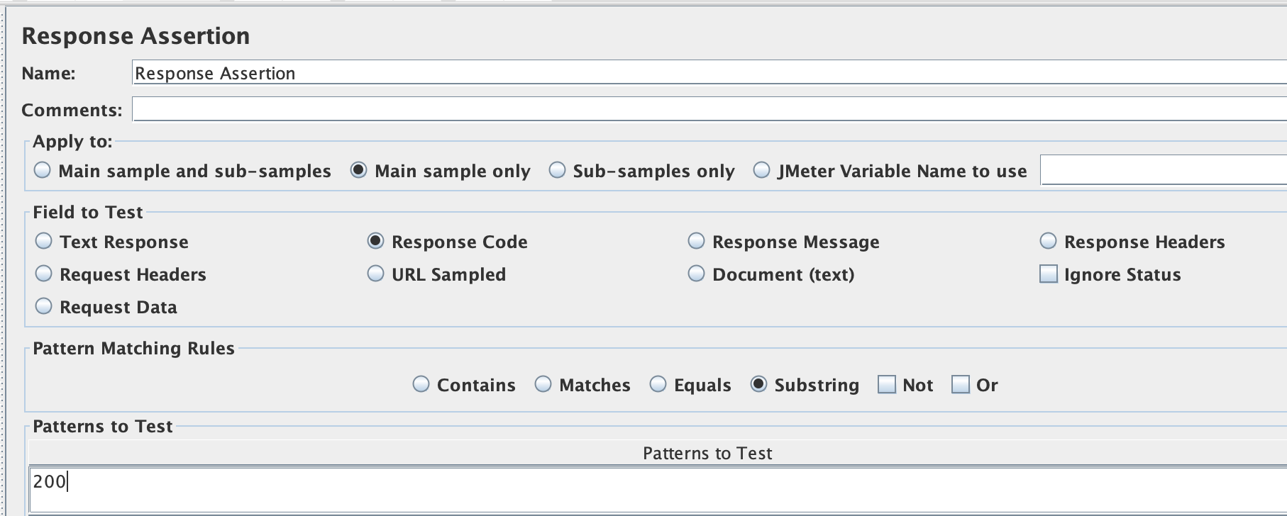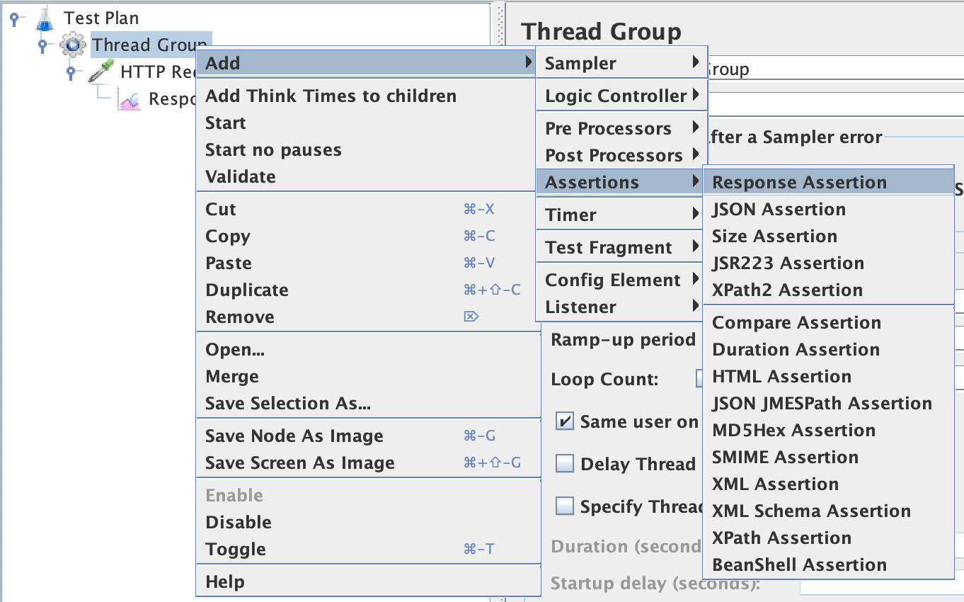 Thread Group을 우클릭하여, Add - Assertions에서 응답 성공 조건을 세부적으로 저정할 수 있다.