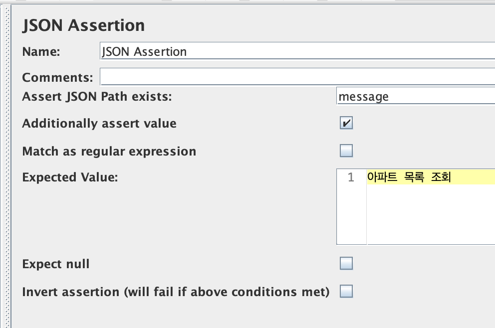 다음과 같이 설정하면, 응답 코드가 200 그리고 응답 JSON의 "message" 값의 value는 "아파트 목록 조히"인 경우에만 성공적인 응답으로 간주한다.