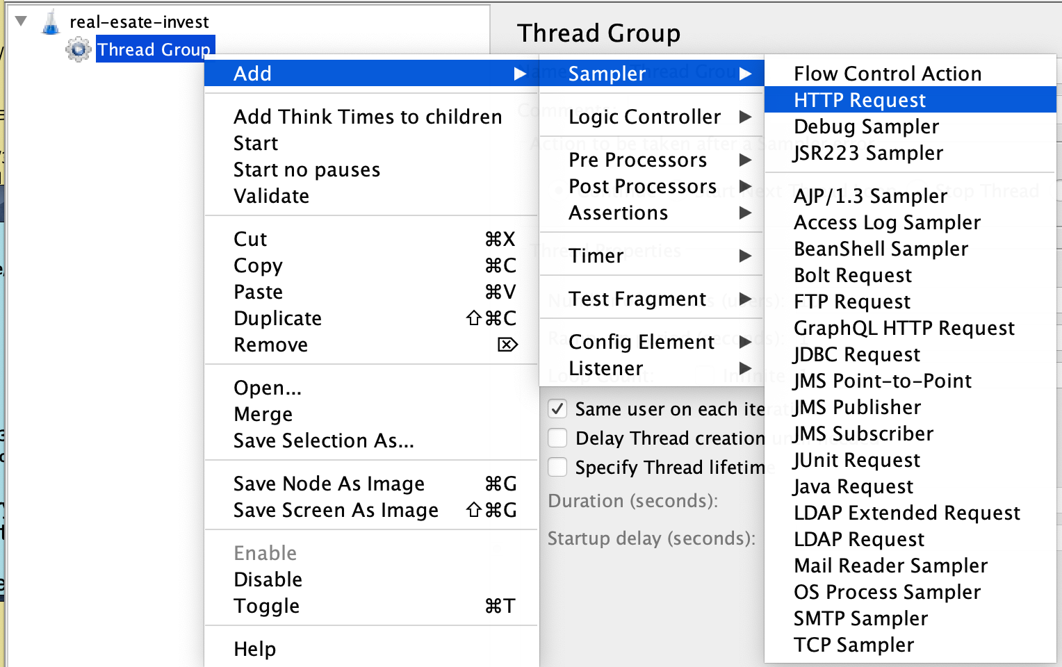Thread Group을 우클릭하여, Add - Sampler에서 다양한 Sampler 들을 선택할 수 있다.