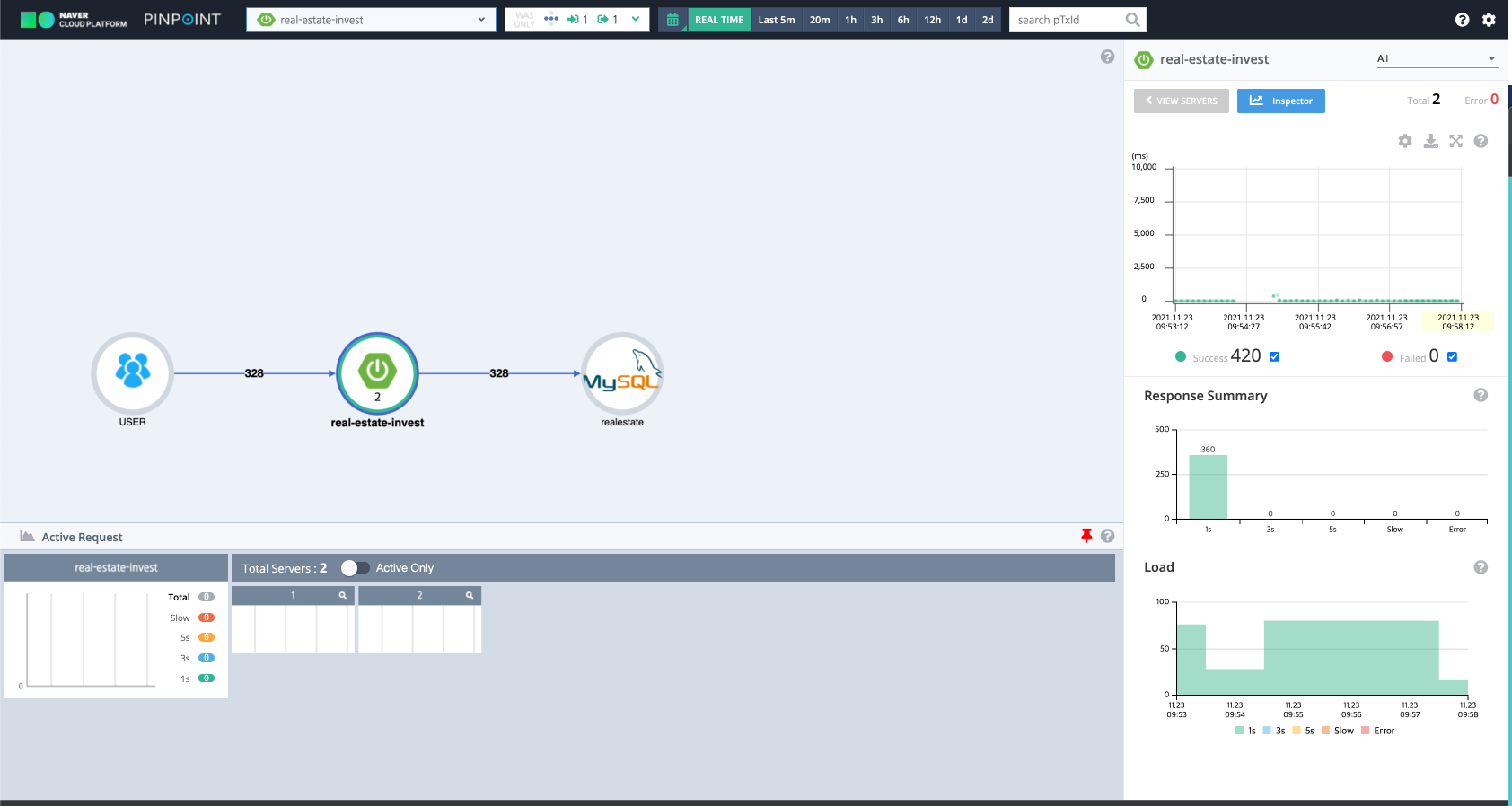다음과 같이 스프링부트 서버의 연결 구조를 가시화하여 볼 수 있고, 오른쪽 탭에서 성능 모니터링을 할 수 있다.