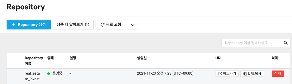 이동한 화면에서 'Repository 생성' 버튼을 클릭한다.