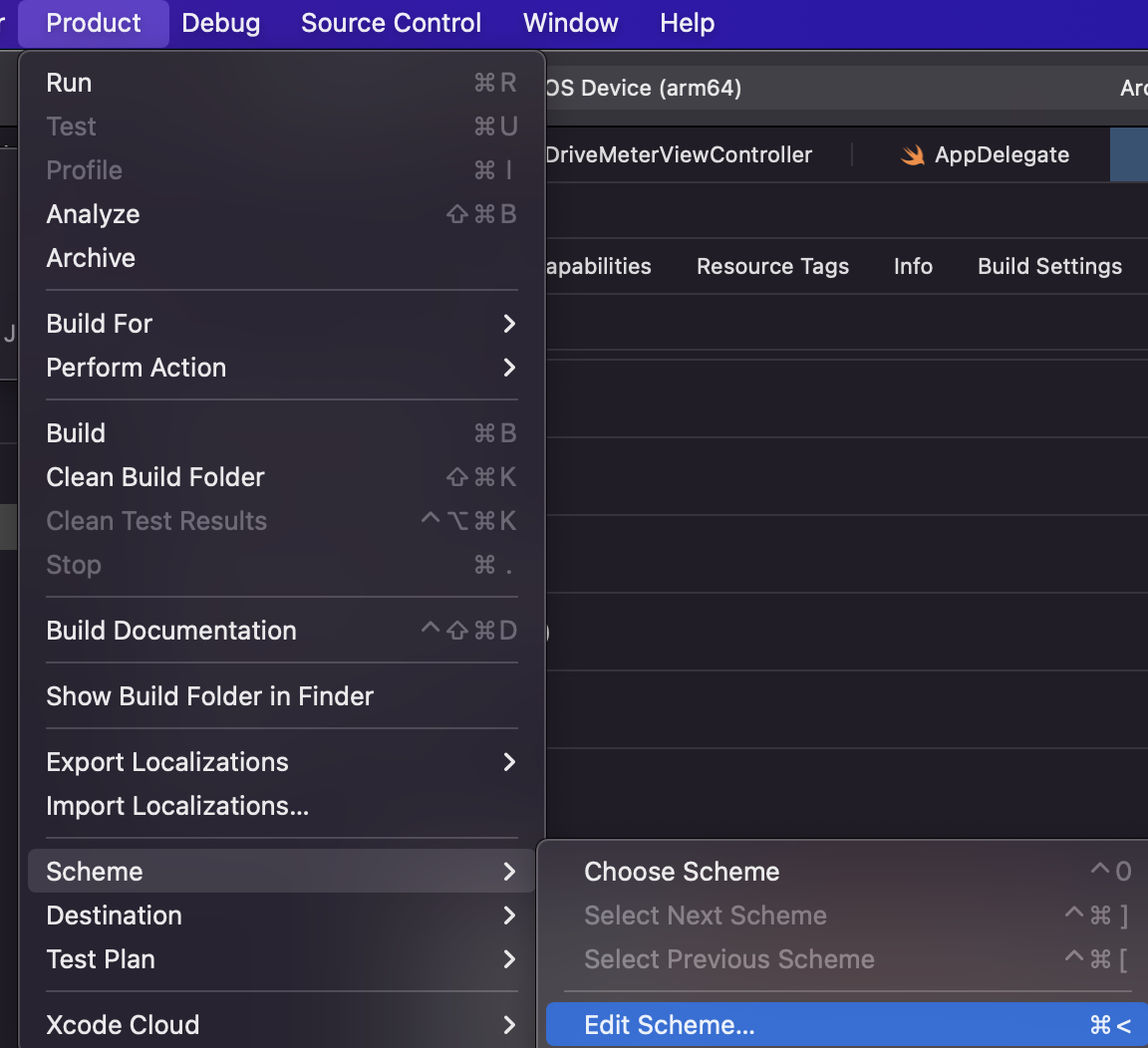 7-1) Xcode의 Product - Schema - Edit Scheme 클릭