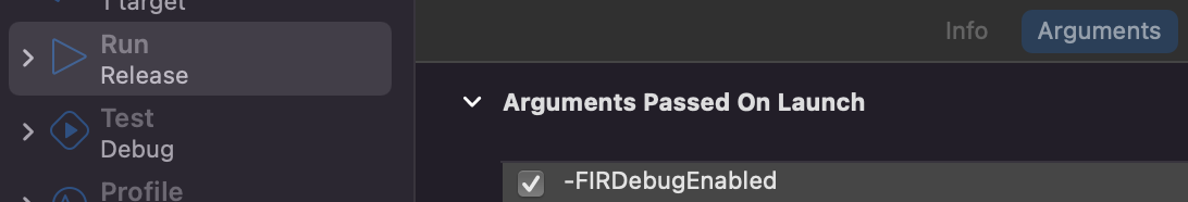 7-2) RUN - Arguments에 'FIRDebugEnabled' 속성 추가하기
