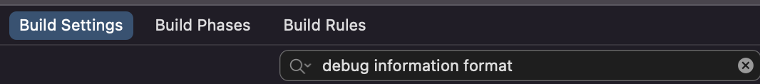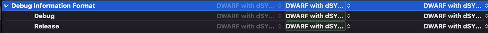 4) 모든 빌드 유형의 형식을 'DWARF with dSYM FILE'로 설정한다.