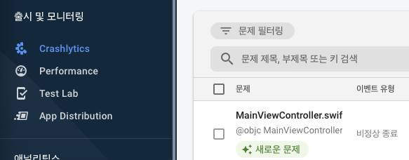 Firbase 홈페이지의 Crashlytics 탭을 클릭하면, 발생된 오류를 확인할 수 있다.