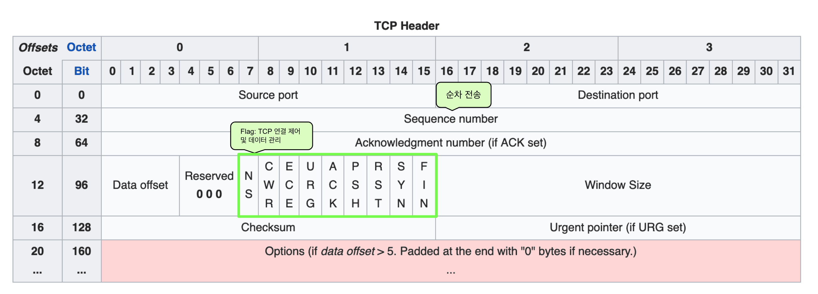 · 9개의 flag 필드 : TCP 연결 제어 및 데이터 관리
