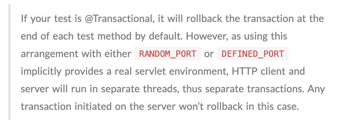 1. WebEnvironment의 RANDOM_PORT, DEFINED_PORT 옵션을 사용하면 실제 테스트 서버는 별도의 스레드에서 테스트를 수행하기 때문에 트랜잭션이 롤백되지 않는다.