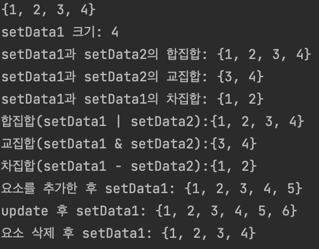 setData1.remove(6) # 요소 삭제, 없으면 에러