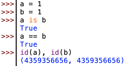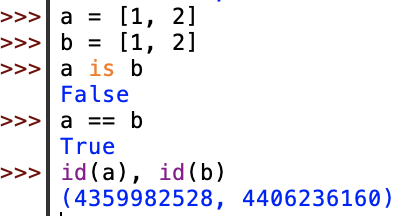 그래서 a is b는 두 객체의 주소가 다르므로 False, a == b는 두 변수의 값이 같으므로 True가 된다.