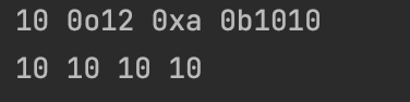 - 반대로 8진수 0o12, 16진수 0xa, 2진수 0b1010을 적어 주면 각각의 값을 10진수로 변환해 준다.