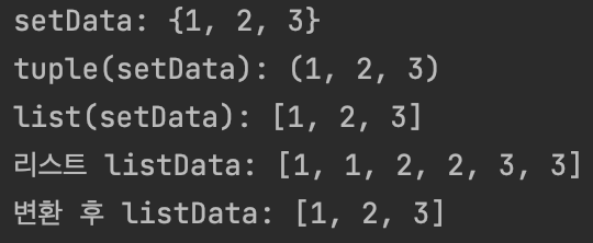 print('list(setData):',list(setData)) # 리스트로 형 변환