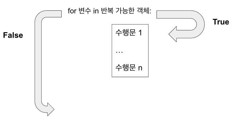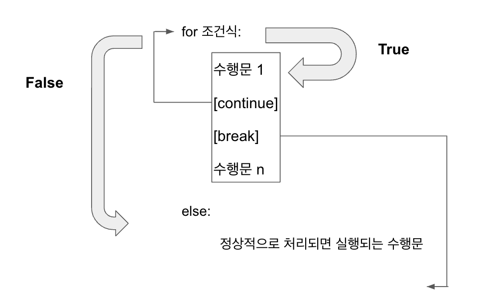 - for 문이 정상적으로 종료되면 else문이 실행되고, break 문에 의해 비성장 종료되면 else문이 실행되지 않는다.
