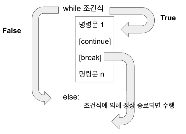 · 파이썬에서는 독특한 문법으로 while~else 문이 존재한다. while이 조건식에 의해 정상적으로 종료되면 else 절이 실행되고, break문에 의해 종료되면 실행되지 않는다.