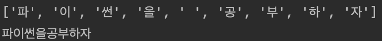 - 문자열 자료형은 문자 한 개 한 개가 모여 이루어진 문자열 집합이므로 for 문으로 문자 단위로 분리할 수 있다.
