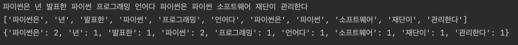 # 분리된 문자열을 ['문자열':개수] 형태의 딕셔너리 자료형으로 만든다.