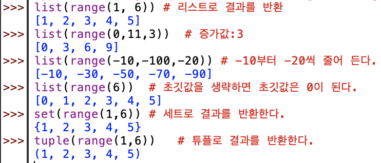 · range 함수는 주어진 숫자 범위 안에서 순차적인 숫자 그룹을 만든다. 숫자 그룹을 만들 수 있는 객체를 반환하기 때문에 묶음 자료형 변수(range(숫자))처럼 range 함수가 처리하여 반환하는 결괏값의 자료형을 적어 주어야 한다.