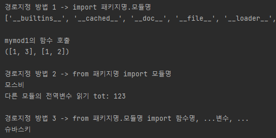 import 모듈.사용자정의모듈other.mymod2 # 메인 파일과 패키지가 다른 위치이므로 import를 한다.