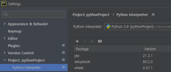 1. 파이참 메뉴에서 [File] - [Settings]를 선택하면, 다음 화면이 나타난다. [Project] - [Python Interpreter]를 선택하고, [+] 버튼을 클릭한다.