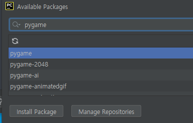 2. 나타나는 'Available Packages' 창에서 검색 입력란에 pygame을 입력한다. pygame이 보이면 선택하고 [Install Package] 버튼을 클릭하여 설치한다.