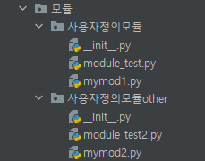 '사용자정의모듈', '사용자정의모듈other' 패키지를 생성한다. '사용자정의모듈' 패키지에는 module_tesy.py, mymod1.py 파일을 작성한다. '사용자정의모듈other' 패키지에는 module_test2.py, mymod2.py 파일을 작성한다.