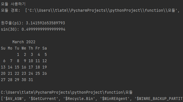 print(dir(모듈.사용자정의모듈.mymod1)) # mymod1에 정의된 멤버 목록을 확인