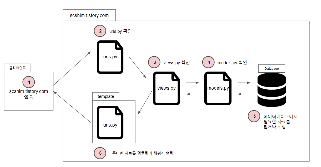 ex) 'scshim.tistory.com'이라는 URL로 접속했을 때 index라는 함수를 실행시킨다. 'scshim.tistory.com/login/'로 접속했을 때 login이라는 함수를 실행시킨다.