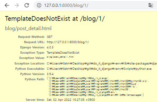 서버를 실행하고, 웹 브라우저에 127.0.0.1:8000/blog/1/을 입력하면, 다음과 같이 TemplateDoesNotExist 오류가 발생한다. 그리고 blog/post_detail.html이 필요하다는 메세지가 보인다.