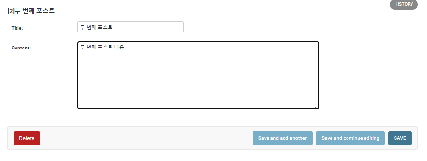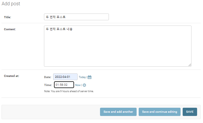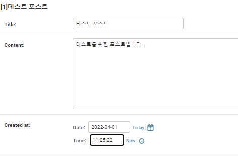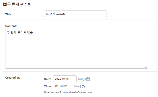 다시 포스트를 작성해보면, 작성 시간이 자동으로 저장되므로 Created at 입력란이 더 이상 보이지 않는다.
