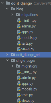 3. 장고 프로젝트 폴더(do_it_django_prj) 안에 settings.py 파일에 두 앱을 등록한다. settings.py에 INSTALLED_APPS 리스트에 'blog', 'single_pages' 앱을 추가한다.