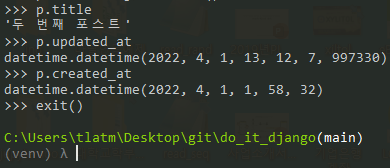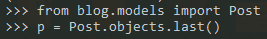 2. blog 앱의 models.py에서 Post 모델을 임포트한다. 그리고 Post.objects.last() 명령어로 데이터베이스에서 Post 모델의 레코드 중 마지막 레코드를 가져와 p에 저장한다.