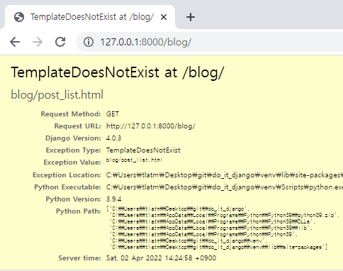 웹 브라우저에 127.0.0.1:8000/blog/를 입력하면, 다음과 같이 TemplateDoesNotExist 오류가 발생한다. 그리고 blog/post_list.html이 필요하다는 메세지가 보인다.
