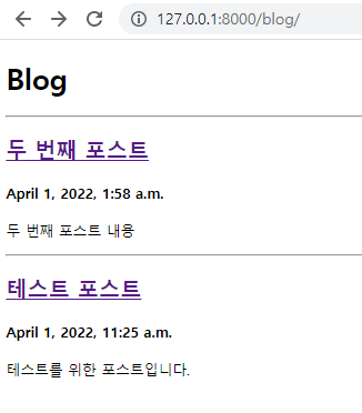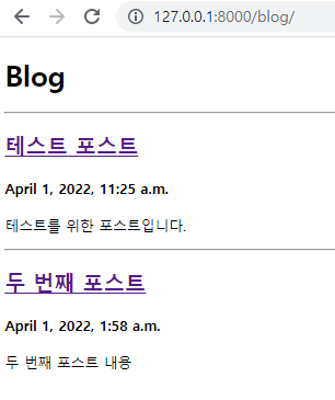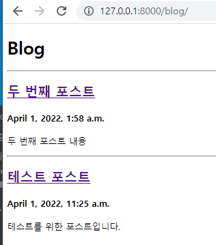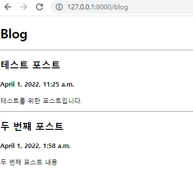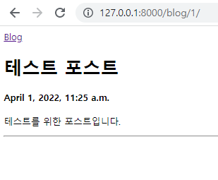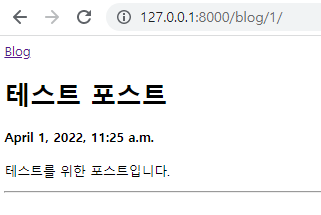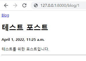 웹 브라우저에서 127.0.0.1:8000/blog/1로 접속하면 아래와 같이 상세 페이지를 볼 수 있다.