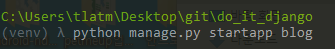 1. 가상환경에서 'python manage.py startapp blog'를 입력하여 blog 앱을 생성한다.
