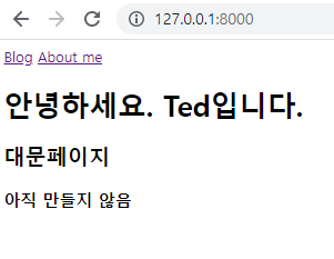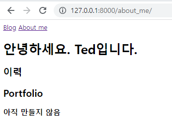 코드를 모두 작성했다면 http://127.0.0.1:8000, http://127.0.0.1:8000/about_me/ 에 접속하여 페이지가 잘 열리는지 확인한다.
