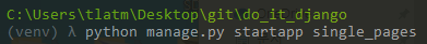 2. 가상환경에서 'python manage.py startapp single_pages'를 입력하여 single_pages 앱을 생성한다.