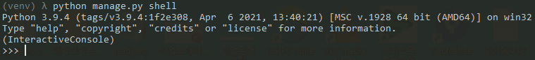 1. 터미널에 'python manage.py shell'을 입력하면 장고 셸이 실행된다.