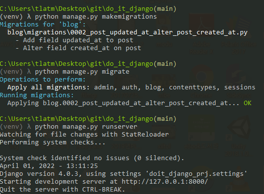 수정한 모델을 makemigrations로 장고로 알려주고, migrate로 데이터베이스에 반영한다. 그리고 서버를 재실행한다.