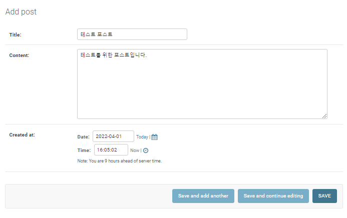 · 문제점 2: 앞서 생성한 포스트를 클릭해보자. Created at 부분을 보면 Now라는 버튼이 있다. 이것을 누르면, 현재 시간이 입력된다. 하지만, 입력되는 시간은 실제 시간과 다를 것이다. 또한 그 아래는 'Note: You are 9 hours ahead of server time'이라는 문구 또한 볼 수 있다. 이것은 그리니치 표준시에 맞춘 시각이라 생기는 문제다. 세계인을 위한 웹사이트가 있다면 이대로 놔둬도 무방하지만, 여기서는 한국을 기준으로 만든 웹 사이트라 가정한다.