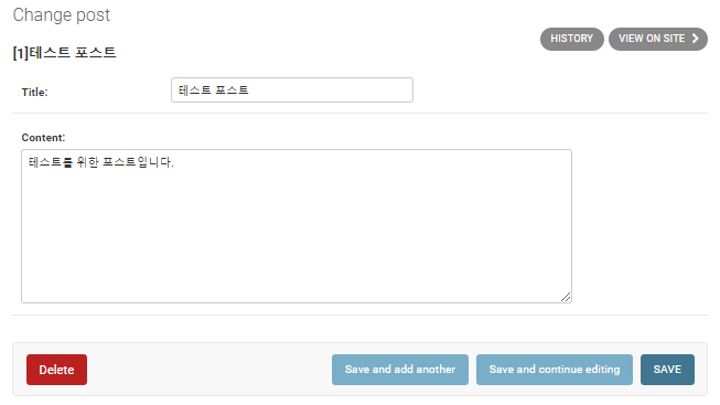 6. models.py 파일의 수정을 완료하고, 관리자 페이지에서 포스트를 하나 열어보면 <VIEW ON SITE> 버튼이 생긴걸 확인할 수 있다.