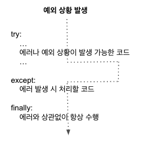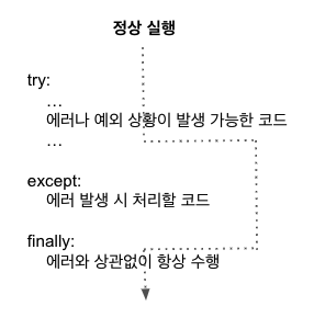 - try 구문 영역에서 실행되는 수행문에서 에러가 발생하지 않으면, except 구문의 수행문은 수행되지 않는다.