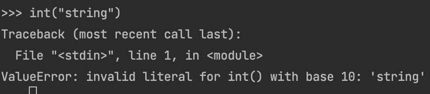 - int()는 str 자료형을 받아들일 수 있지만, "string"은 숫자로 변환할 수 없어 ValueError가 발생한다.