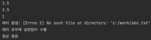 - file = open('c:/work/abc.txt')에 대한 에러 처리 클래스는 FileNotFoundError를 사용할 수 있다.