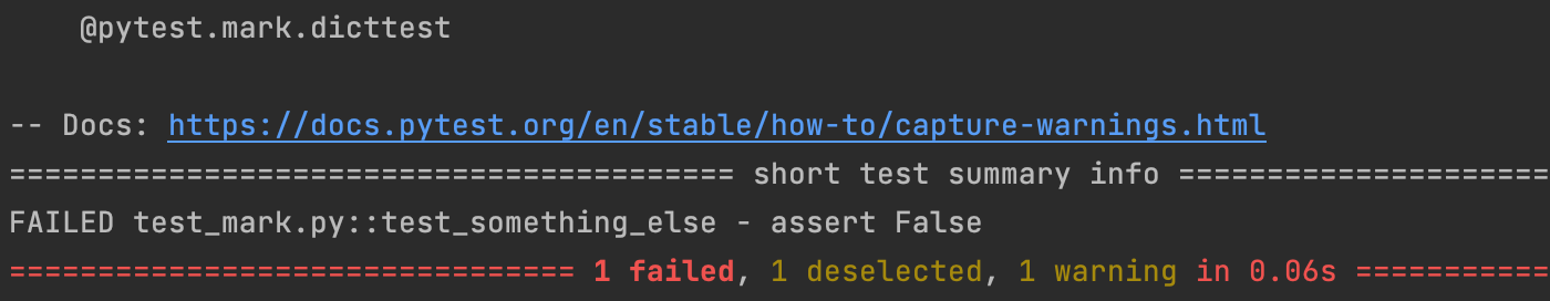 $ pytest -v test_mark.py -m "not dicttest"