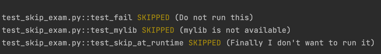 - pytest.skip() 함수를 사용하여 테스트를 건너뛴 것으로 표시하고 다음 함수로 이동할 수 있다.
