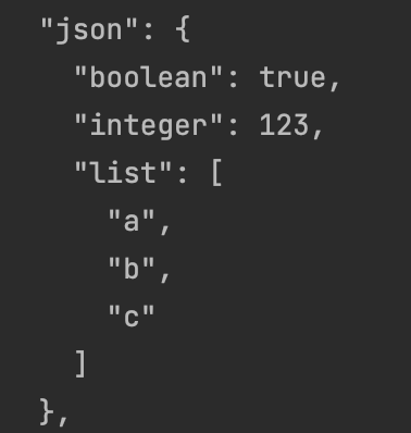 data = {'integer': 123, 'boolean': True, 'list': ['a', 'b', 'c']}